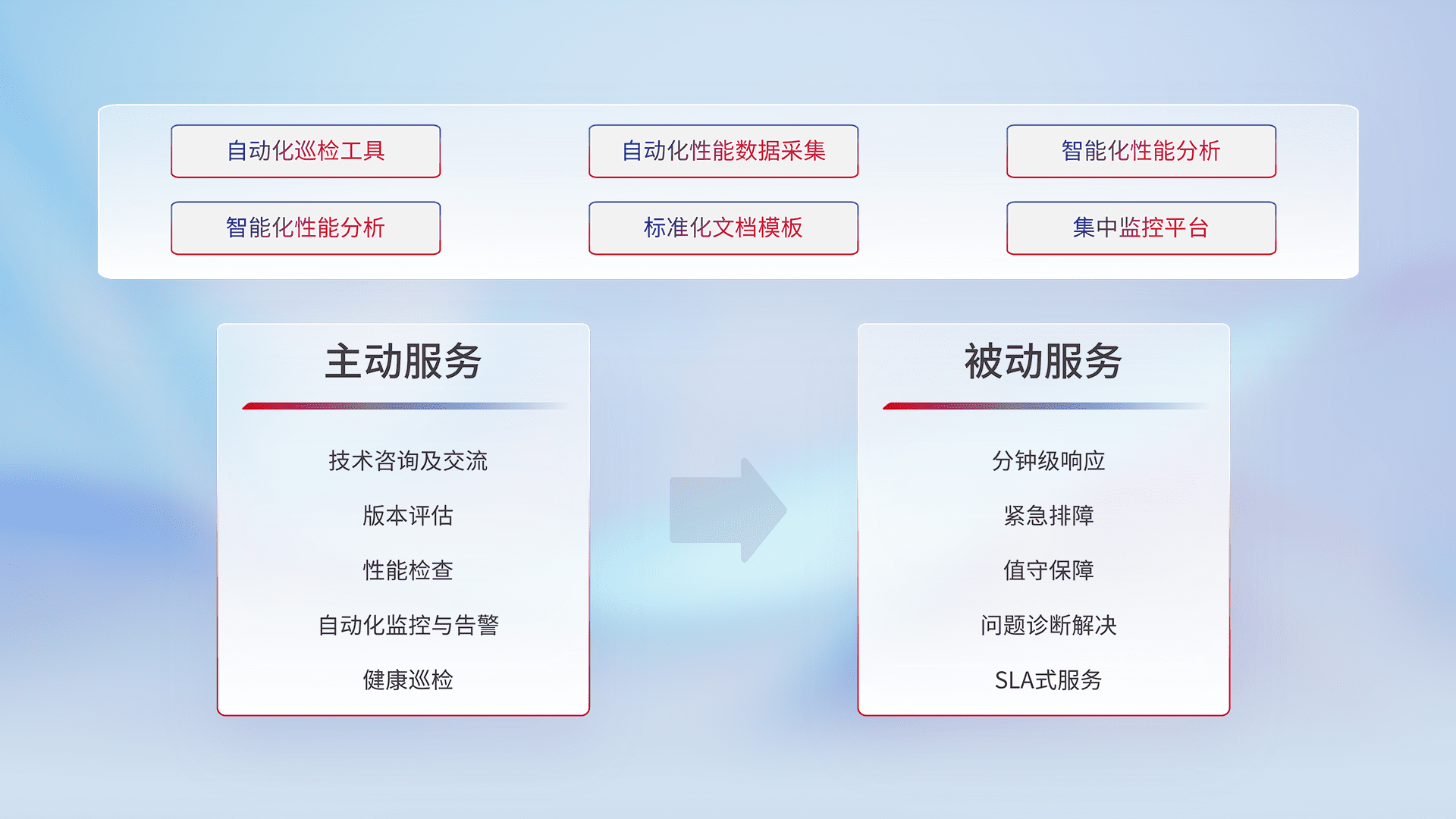 智能化工具和标准化文档,,,,保障服务质量,,提供主动服务(包含技术咨询、、版本评估、、、、性能检查、、、自动化监控与告警、、健康巡检)和被动服务包含(分钟级响应、、、、紧急排障、、、、值守保障、、、问题诊断解决、、、SLA服务)。。。。