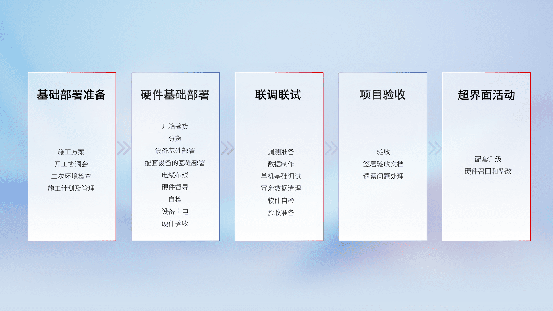 从基础部署准备、、、、硬件基础部署、、、、联调联试、、、、项目验收、、越界面活动的全过程可追溯,,,保证施工质量和进度。。。。